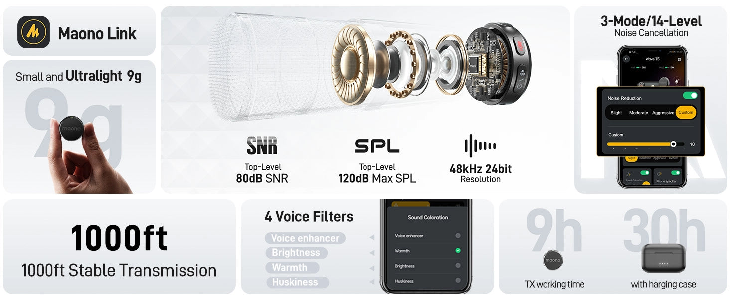 The advanced dedicated ENC chip built into this tiny wireless lapel microphone allows you to get a clear, undistorted sound. You can turn on the noise reduction button and adjust the noise cancellation level via the Maono Link app as needed, and there are light/ Moderate/Strong 3 modes for your selection.