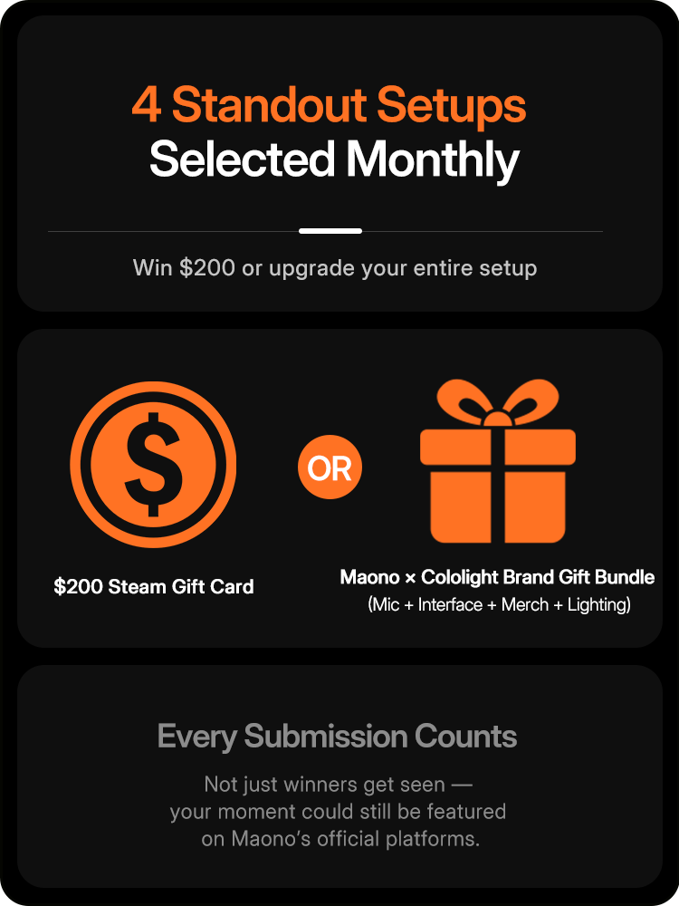 Standout setups may be reposted on Maono's official channels and community pages.